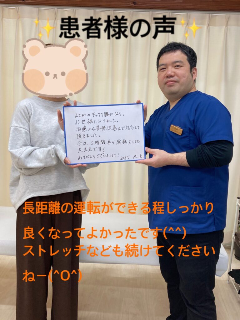 まさかのぎっくり腰になり、お世話になりました。治療から姿勢改善まで対応していただきました。今は5時間車の運転をしても大丈夫です!ありがとうございました!