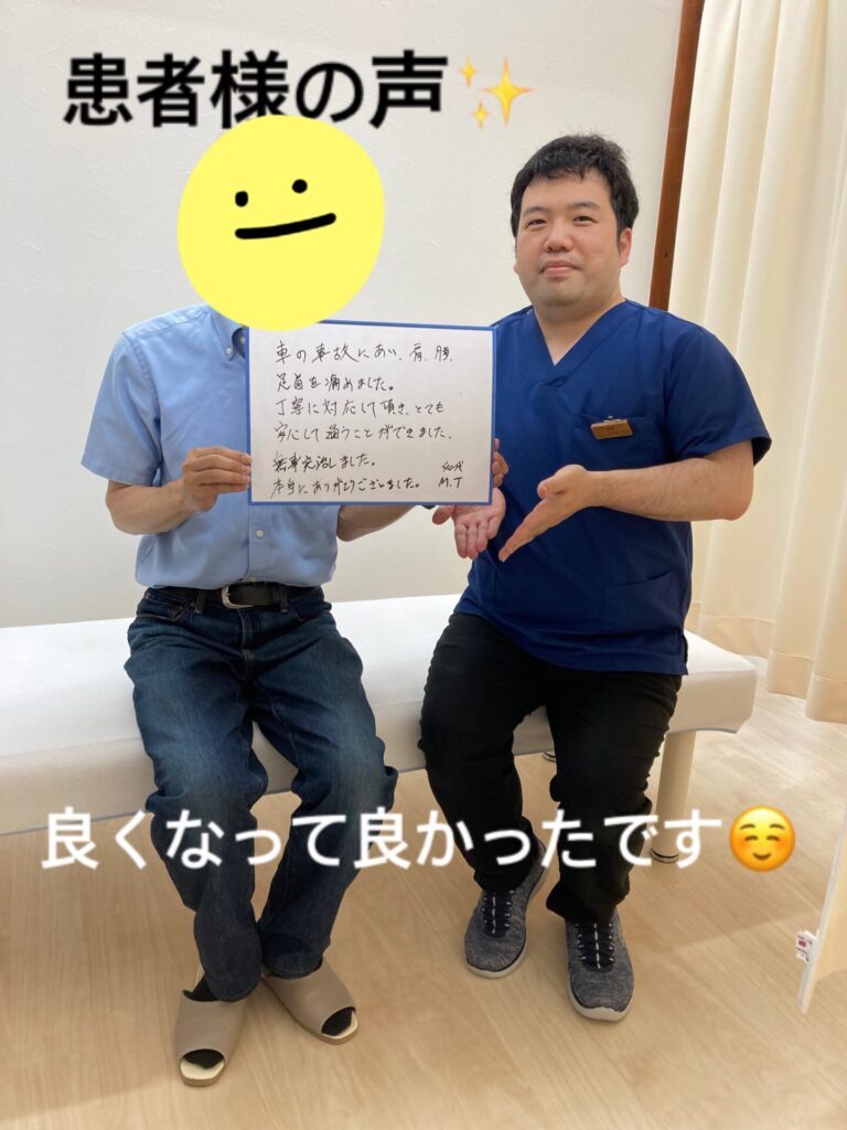 車の事故にあい、肩・腰・足首を痛めました。丁寧に対応していただき、とても安心して通うことができました。無事完治しました。本当にありがとうございました。